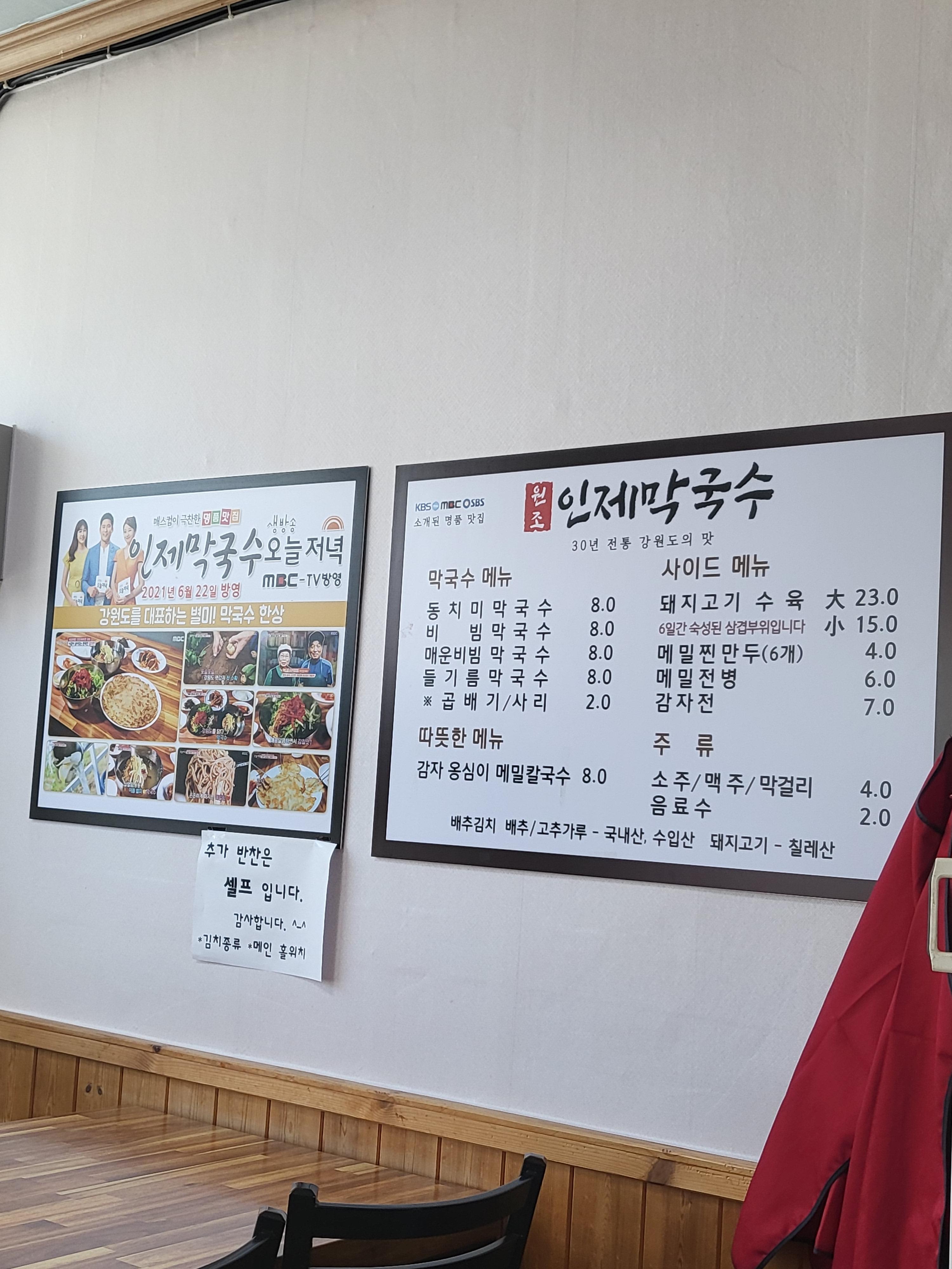 식사를 어디에서할지 막막했는데 바로 근처에 인제막국수라는 맛집이 있더라구요! 민속박물관 주차장에 차를 그대로 두시고 바로 1분만 주차장 앞 골목으로 이동하시면 빨간 간판이 보입니다. 공중파에도 출연한 맛집이고, 깨끗하고 맛있습니다. 특히 감자전이 맛있었구요 막국수는 당연히 맛있었어요.
