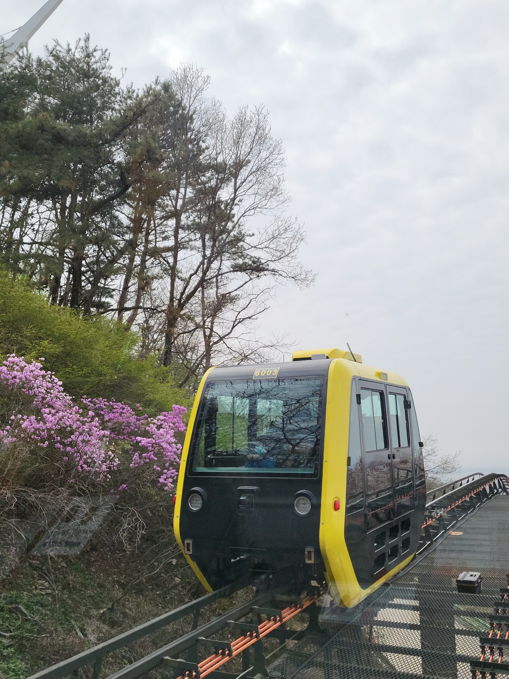 강화군 교동도는 가장 가까운 곳 기준으로 약 1.8km 떨어진 곳에 북한땅이 보이는 접경지역입니다. 이 화개산에 모노레일과 전망대가 생겨 아버지를 모시고 효도 드라이브를 했어요. 48번 국도가 상습정체라 여러분의 네비게이션의 다양한 추천경로 중 48번국도를 가장 짧게 타는 루트를 선택하실 것을 강력 추천합니다. 실제 주행을 해보면 예상시간보다 더 소요된다는 점 꼭 기억하시고 톨비를 지불하더라도 고속도로나 다른 도로로 우회하는 경로를 추천드립니다. 자 소개합니다. 1박2일 프로그램에도 나온 모노레일입니다.