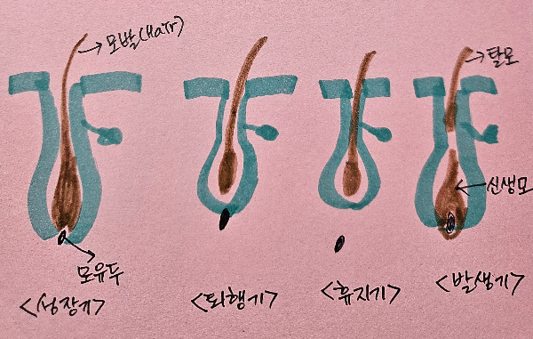머리카락의 하루 성장 길이는 약 0.3∼5mm, 눈썹 0.18mm, 턱수염 0.38mm 정도입니다. 발생기는 신생모이고, 성장기는 5-6년의 모발로 약 80% 정도는 여기에 해당합니다. 퇴행기는 2-3주로 약1%가 여기에 해당합니다. 휴지기는 3-4개월정도의 시기이고, 약14%의 모발이 휴지기에 해당하고 성장이 멈추고 탈락을 하게 됩니다. 따라서 휴지기에 15%이상의 모발이 빠지면 탈모라 판단하게 됩니다.