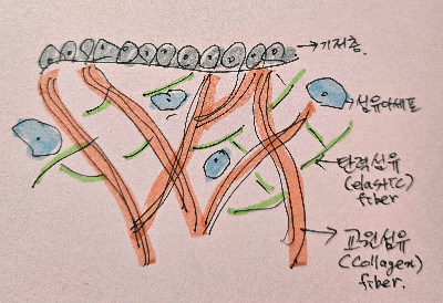 | 교원섬유(collagen) | 콜라겐 섬유는 진피 성분의 90%를 차지하며 피부에 장력을 제공한다. |