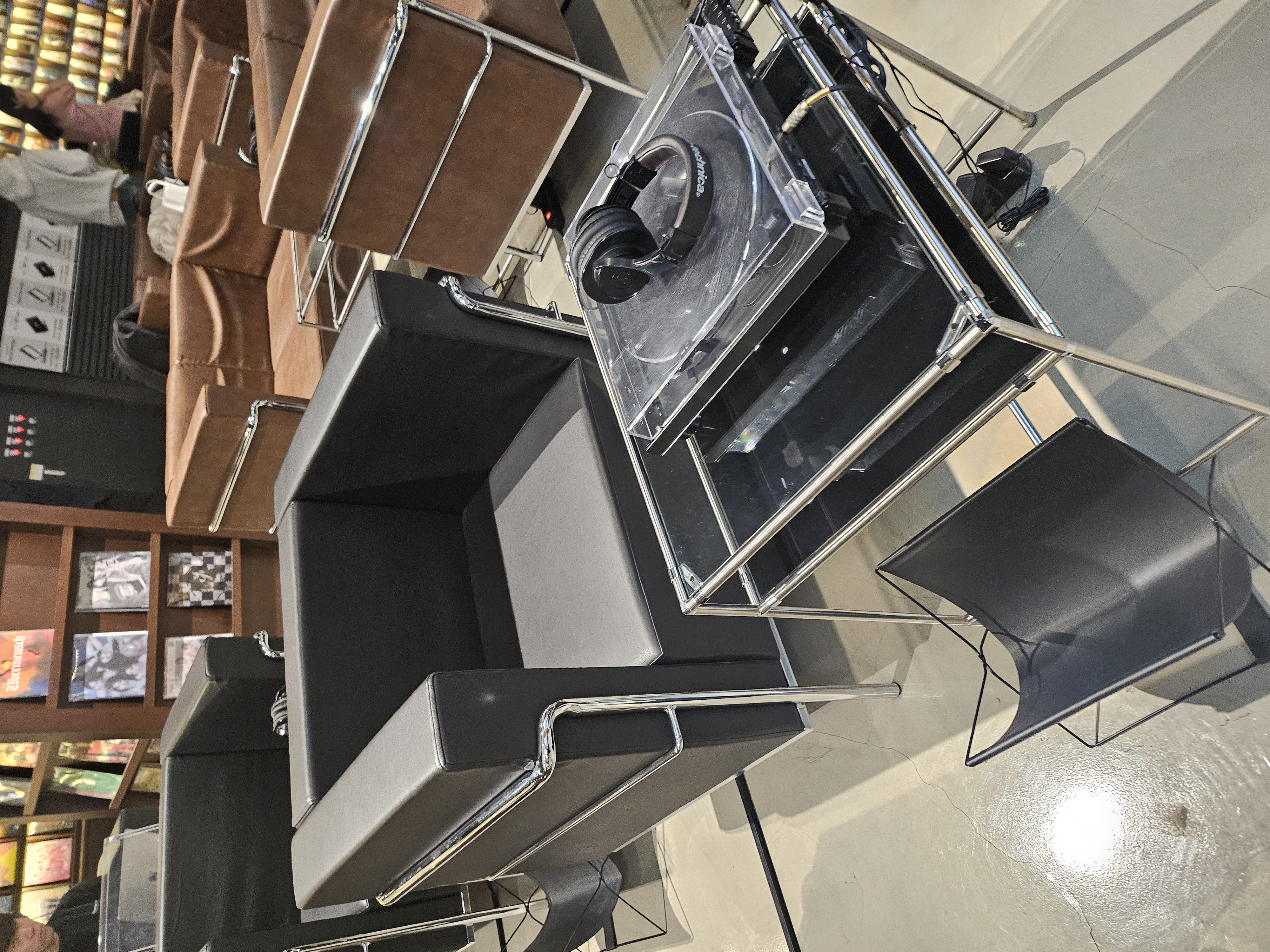개별 청취: 전 좌석에 개별 턴테이블과 헤드셋이 비치되어 있어 원하는 LP를 직접 골라 자유롭게 들을 수 있습니다.