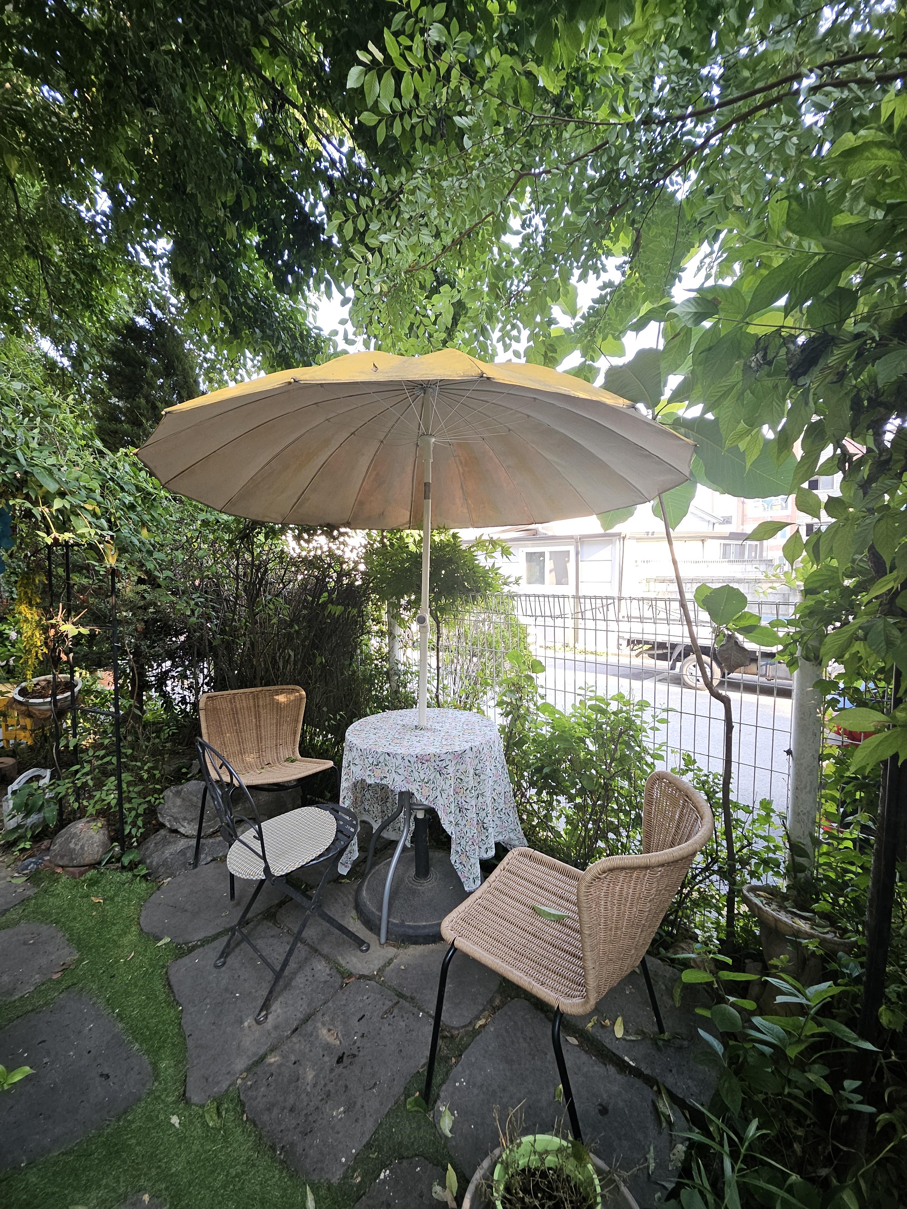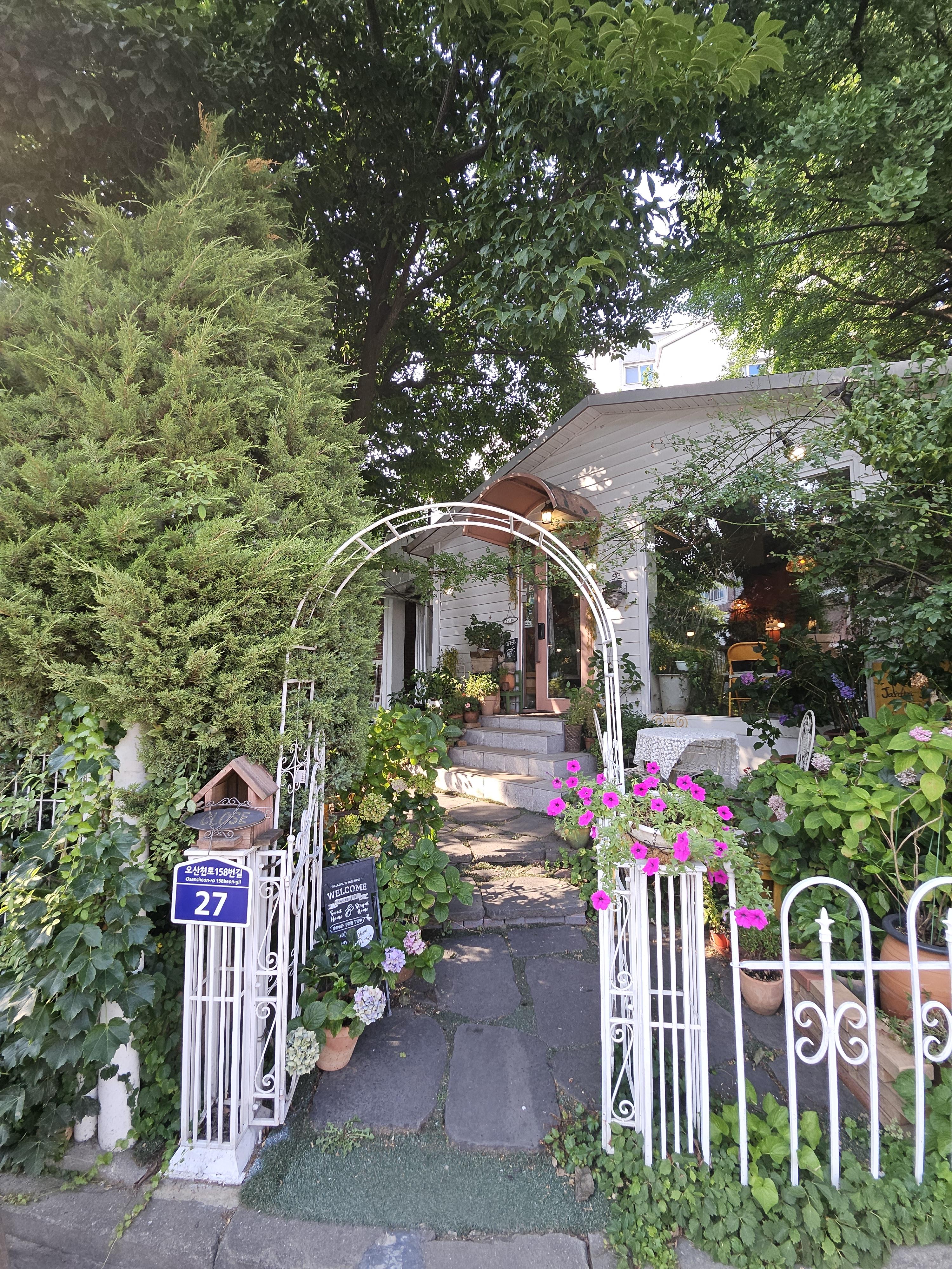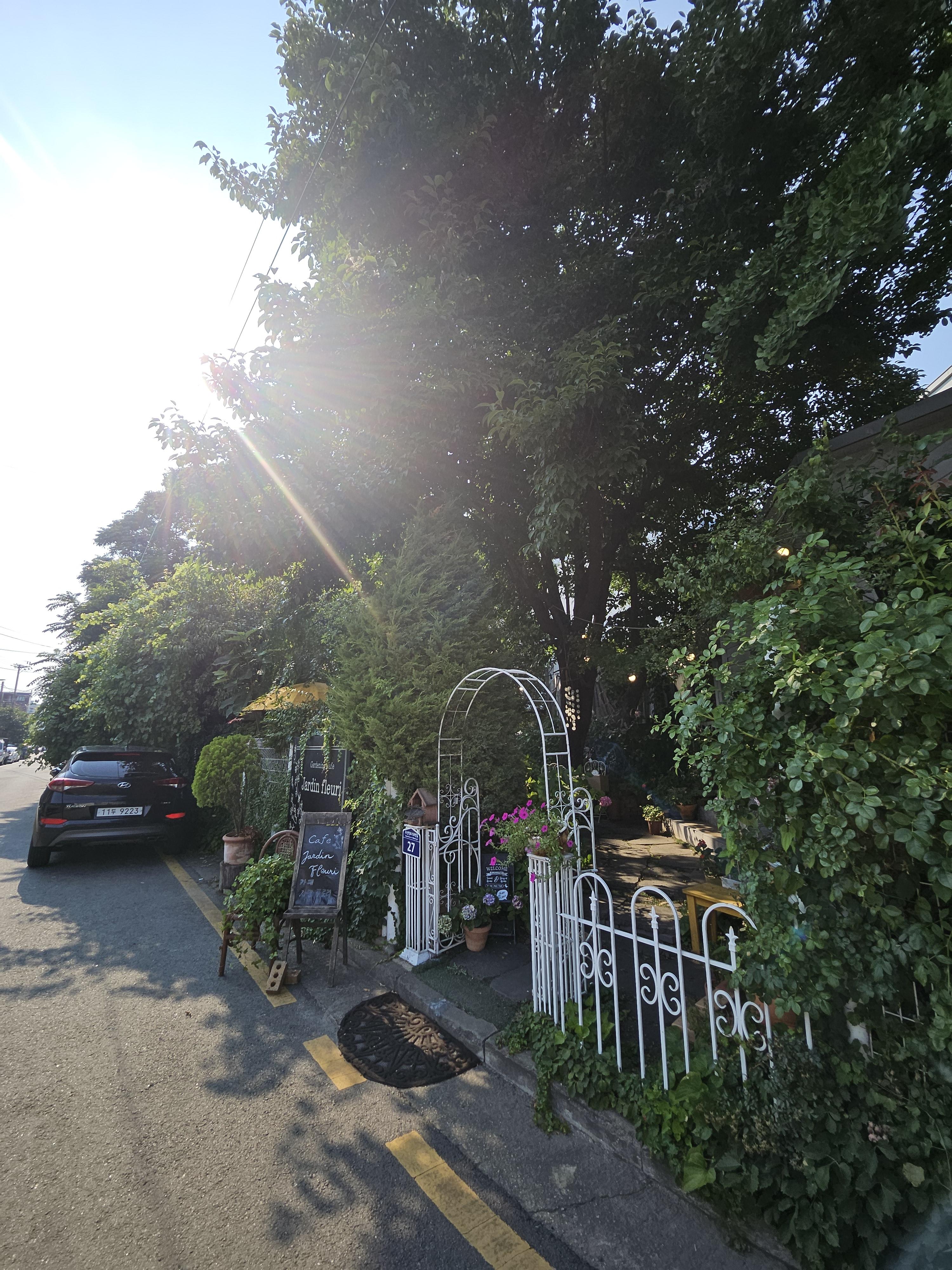 오산역 2번출구에서 5분 걸어가니 동화속 요정이 살고 있는 듯한 카페가 나오네요 자뎅플로리입니다. 커다란 나무들이 그늘을 만들고 바로 앞에는 오산천이 흐르는 고요한 동네에요. 차는 공영주차장에 세우거나 골목이 한적하여 골목에 세우셔도 됩니다.