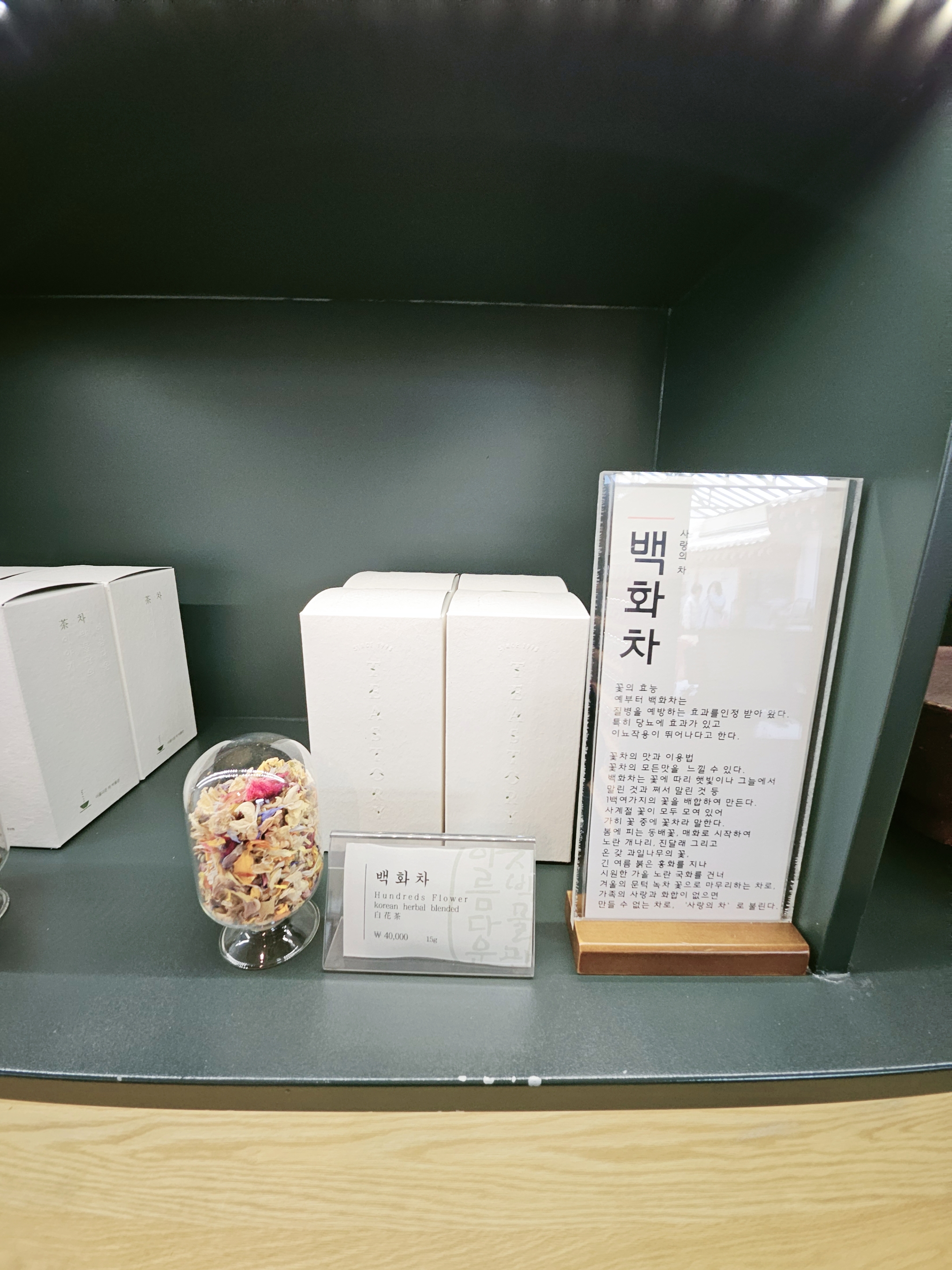 인사동 중간블럭에 있구요. 메인스트리트와 종로경찰서 사잇길에 있습니다. 백화차 100가지 꽃잎을 말려서 만든 백화차 마셨는데, 차 우려내는 방법도 알려주십니다.