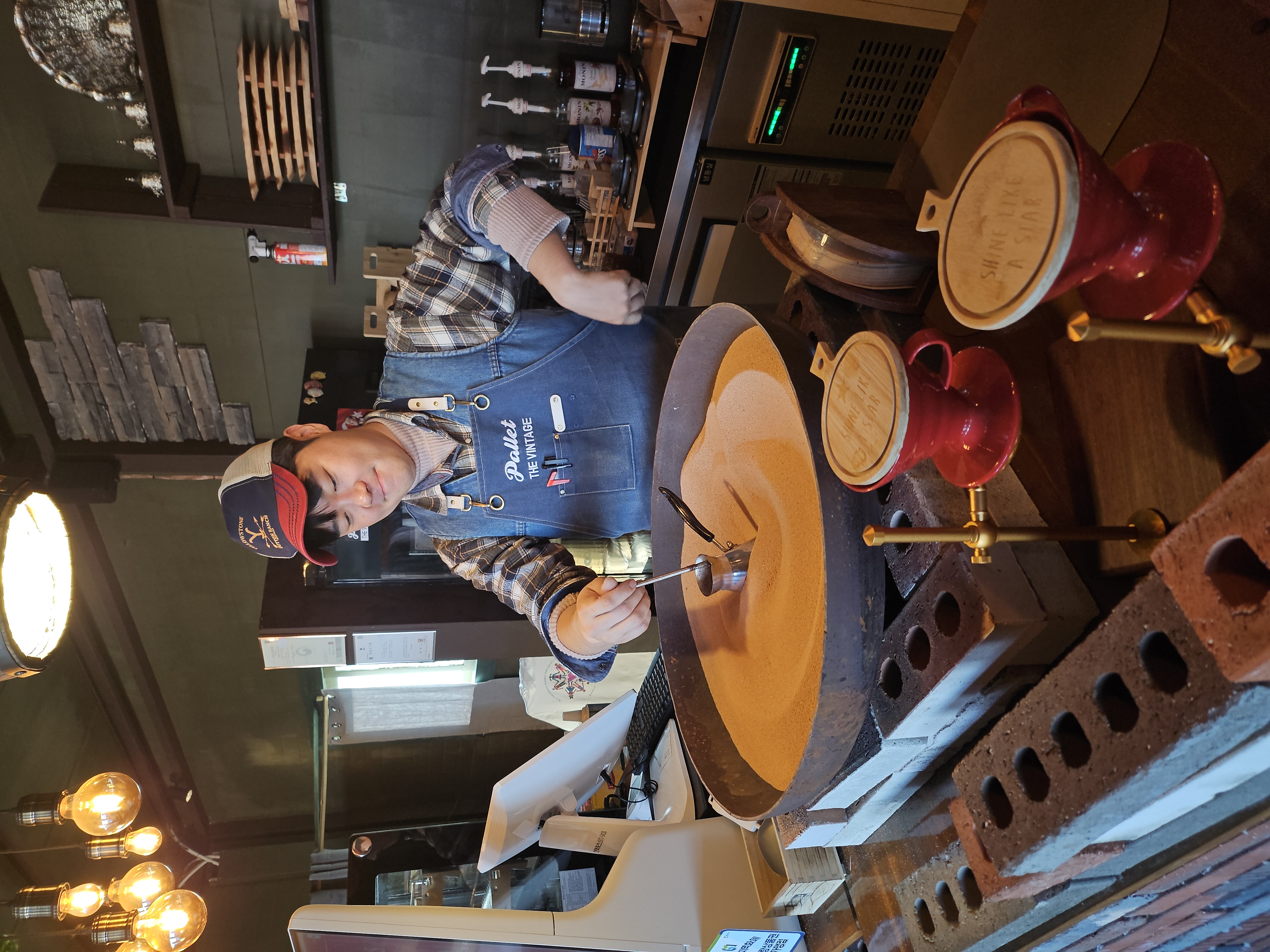 오늘은 미국서부의 컨트리송이 퍼져 나오는 특이한 카페 소개합니다. 평택의 먹자대로인 죽백동에 있어요. 큰길 양쪽에 많은 음식점과 다이소가 있어요. 죽백동의 코지하우스에서 식사를 하고 새로 생긴 파레트 더 빈티지를 방문했답니다. 독특하게 주인장님이 샌드커피를 만들어 주시네요. 진짜 모래에 커피를 데우는 방식이었어요. 인테리어는 창고 또는 미국 목장의 느낌이었고요. 음악은 컨트리음악이 흘러나왔어요. 빈티지의류와 미국군복 콘셉트의 빈티지소품, 의류 등도 예쁘게 디스플레이해놓으셨네요. 주변에 포도밭으로 둘러싸인 곳이라 봄에 방문하면 더욱 좋을 것 같아요.
