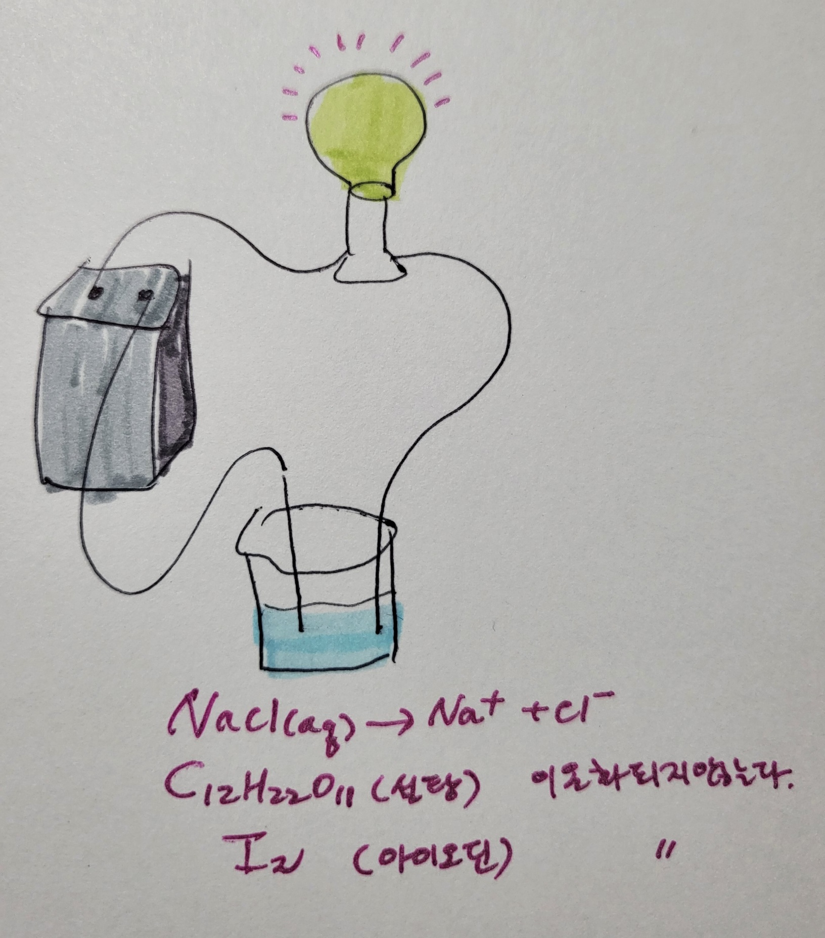 물질은 한 종류의 원소로 이루어진 물질을 원소 또는 홑원소물질이라고 하고 2종류 이상의 원소로 이루어진 물질을 화합물이라고 한다. 예를 들어 산소 기체는 산소로만 이루어져 있으므로 원소에 해당하고, 염화나트륨은 나트륨과 염소 2종류의 원소로 이루어져 있으므로 화합물이다. 산소 기체나 염화나트륨은 증기압력이나 끓는점, 녹는점 등 화학적 성질이 일정하다. 그런데 산소 기체와 수소 기체를 혼합하면 어떻게 될까? 또는 염화나트륨을 물과 혼합하면 어떻게 될까? 순수한 한 가지 물질만 존재할 때와는 전혀 다른 화학적 성질을 지니게 된다. 우리는 이렇게 두 가지 이상의 물질이 섞인 물질을 혼합물이라고 한다. 혼합물 중에도 흙탕물은 불균일혼합물이라고 부른다. 그 이유는 채취한 위치에 따라 물과 흙의 비율이 다르기 때문이다. 그러나 물과 설탕을 혼합한 용액의 경우 물과 설탕의 혼합된 비율이 일정한데 이것을 균일혼합물이라고 하고, 이 균일혼합물을 용액이라고 한다. 모든 기체 혼합물은 용액이다. 공기는 대표적인 기체 혼합물이고 기체 용액에 해당한다. 기체 용액의 경우 모두 한가지 상태로만 존재한다. 공기를 구성하고 있는 성분 물질들은 저마다 고유한 성질을 지닌다. 예를 들어 끓는점이 다 다르다. 따라서 냉각시키면 끓는점 차이를 이용하여 공기를 구성하는 성분 기체들을 분리해낼 수 있다. 고체용액도 존재한다. 한 원소의 원자들이 그들의 크기가 비슷한 다른 원소의 결정으로 들어가서 고체 혼합물을 만들기도 한다. 대표적인 예가 합금인데 구리와 금의 합금이나 강철 속에 녹아 있는 소량의 탄소가 고체 혼합물의 사례이다. 액체 용액의 사례는 우리 주변에서 흔히 볼 수 있다. 알코올과 물의 혼합물은 액체-액체의 용액이고, 물에 이산화탄소를 녹인 탄산수는 액체-기체의 용액에 해당한다. 설탕과 물의 경우 고체-액체의 용액에 해당한다. 이러한 용액의 경우 혼합되기 전의 순수한 물질의 증기압력보다 증기압이 낮아지는 현상이 일어난다. 이러한 증기압 내림 현상에 의한 끓는점 오름이나 어는점 내림을 설명하려면 용질이 얼마나 녹아 있는가를 알아내야 하고, 이렇게 용매와 용질의 혼합비율을 농도라는 개념으로 설명한다. 즉 농도란 용액의 진하기로, 용매에 용질의 혼합비율이라고 말할 수 있다. 화학에서 흔히 사용하는 농도로는 퍼센트 농도가 있다. 일상 생활에서도 많이 사용하는 농도로 용액 속의 용질의 질량비율을 백분율로 나타낸 것이다. 예를 들어 10%의 설탕물 용액 100g 속에는 설탕이 10g, 물이 90g이 존재함을 의미한다. 화학에서 많이 쓰는 두 번째 농도로는 몰농도가 있다. 용액 1L당 존재하는 용질의 몰수를 의미하는 농도이다. 예를 들어 설탕물 1M(몰농도) 1L가 존재한다면 그 속에 설탕이 1몰 존재한다는 의미이다. 설탕은 분자량이 342이므로, 설탕물 1000mL 속에 설탕 342g이 존재한다는 의미이다. 화학에서 많이 쓰는 농도에는 몰랄농도(m)도 있다. 몰랄농도는 용매 1kg당 존재하는 용질의 몰수를 의미한다. 설탕물 1몰랄 농도는 용매인 물 1kg 속에 설탕 1몰을 녹인 용액을 의미한다. 다시 말해 물 1000g에 설탕 1몰인 342g을 녹인 용액이다. 몰랄농도는 질량의 개념으로만 표현하므로 온도가 변하여도 농도가 변하지 않는 특성을 지닌다. 반면 몰농도는 용액의 부피를 사용하므로 온도에 따라 용액의 부피가 변하므로 농도도 변하는 특성이 있다. 이처럼 용액의 성질은 용질이 녹아 있는 함량이 중요하므로 용액의 성질을 연구하는 단계에서는 농도나 용해도의 개념으로 조성을 파악하는 것이 첫 번째 단계라고 할 수 있다. 흥미로운 용액의 성질에는 전기전도성이 있다. 설탕물은 전기가 흐르지 않지만 소금물은 전기가 잘 흐른다. 설탕은 에탄올에 잘 용해되지만 역시 전기가 흐르지 않는다. 요오드(아이오딘)은 물에는 잘 녹지 않지만 에탄올에는 잘 녹는다. 에탄올과 요오드 용액에도 전지가 잘 흐르지 않는다. 이러한 성질은 어떻게 설명할 수 있을까? 전기전도성을 결정하는 요인은 전하를 날라다 주는 입자의 존재 여부다. 설탕은 분자성 물질로 물이나 에탄올에 용해되어도 단지 분자 사이에 섞일 뿐 이온화되지 않아 전자를 이동시킬 수 없다. 반면 소금은 염화나트륨으로 물에서 나트륨 이온과 염화 이온으로 이온화되어 이온들이 전하를 이동시키는 역할을 한다. 그러나 요오드는 요오드 원자 2개가 결합한 분자성 물질로 무극성을 띠므로 물에는 용해되지 않지만, 에탄올에는 용해된다. 그러나 이온화되지 않아 전하를 날라주는 입자가 존재하지 않으므로 전기가 흐르지 않는다.