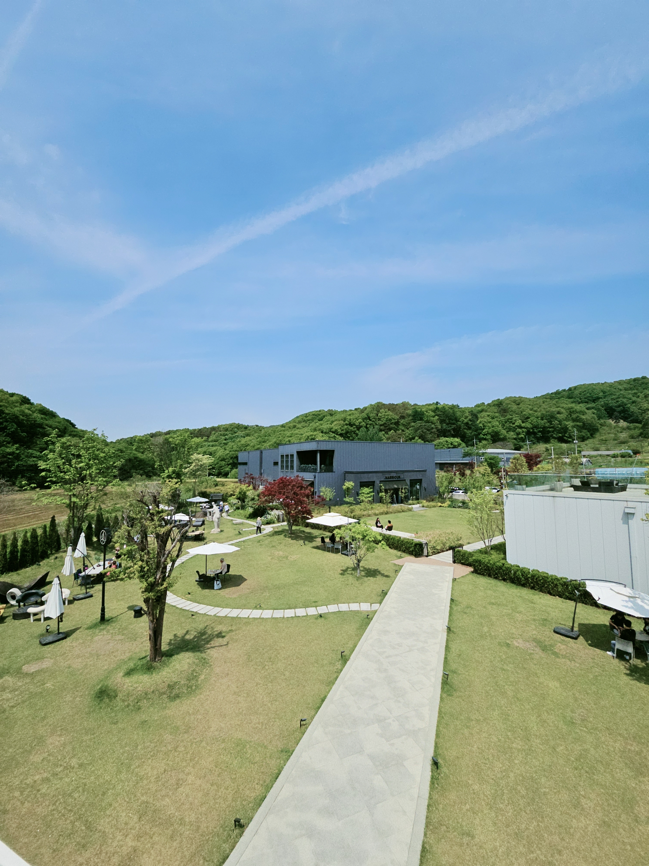 용인시 백암에 유럽풍 카페 빌라드파넬 소개합니다. 엄청난 크기의 물류창고 같은 외관이 먼저 나와서 카페가 있을 줄 몰랐어요. 마당안으로 들어가니 조경상을 수상한 멋진 건물이 있네요. 넓은 잔디밭, 연못, 수영장, 하얀 건물~유럽에 온듯한 느림이에요. 휠체어 입장가능하고...물류창고 같았던 건물은 가구전시장 및 아울렛이에요.