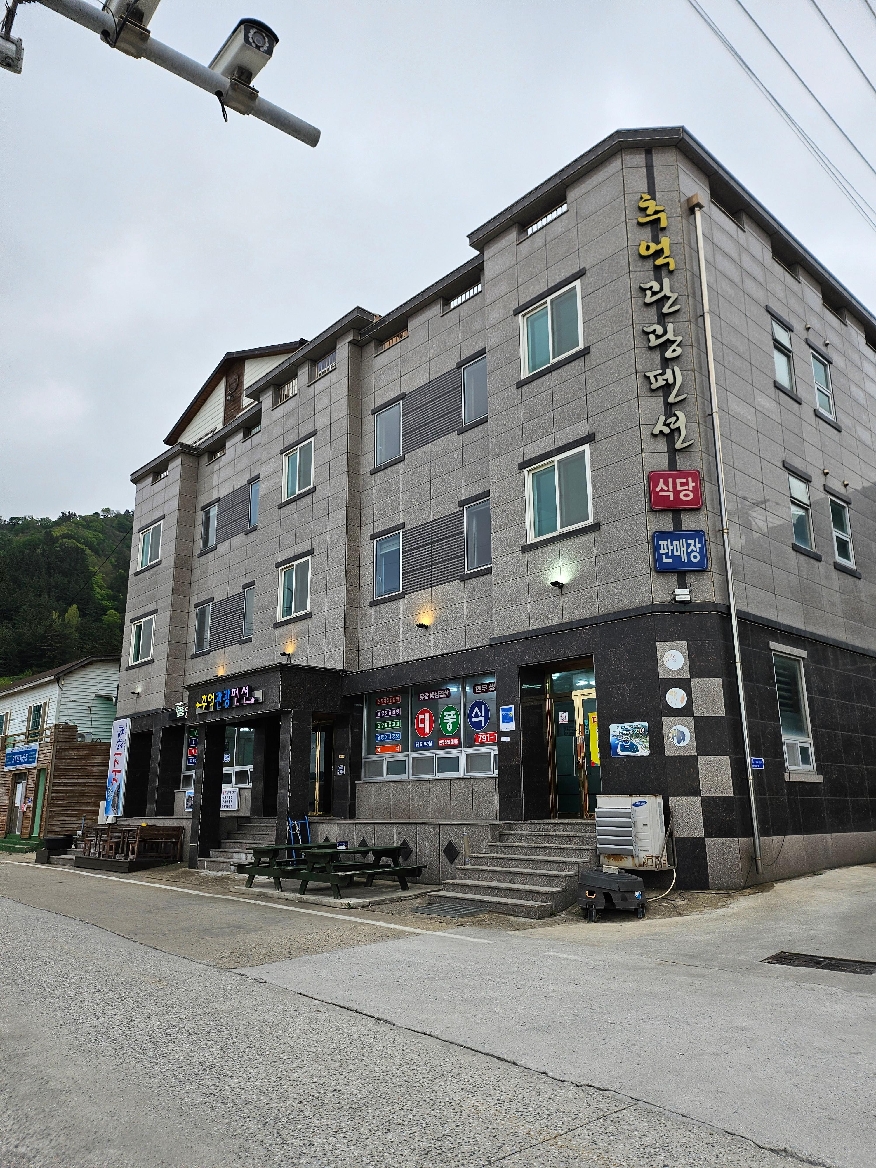추억관광펜션은 주도로 앞에 있어요. 1층에 식사가능한 음식점이 있구요. 엄청 넓고 물이 온천물처럼 매끈거려서 너무 좋았어요.