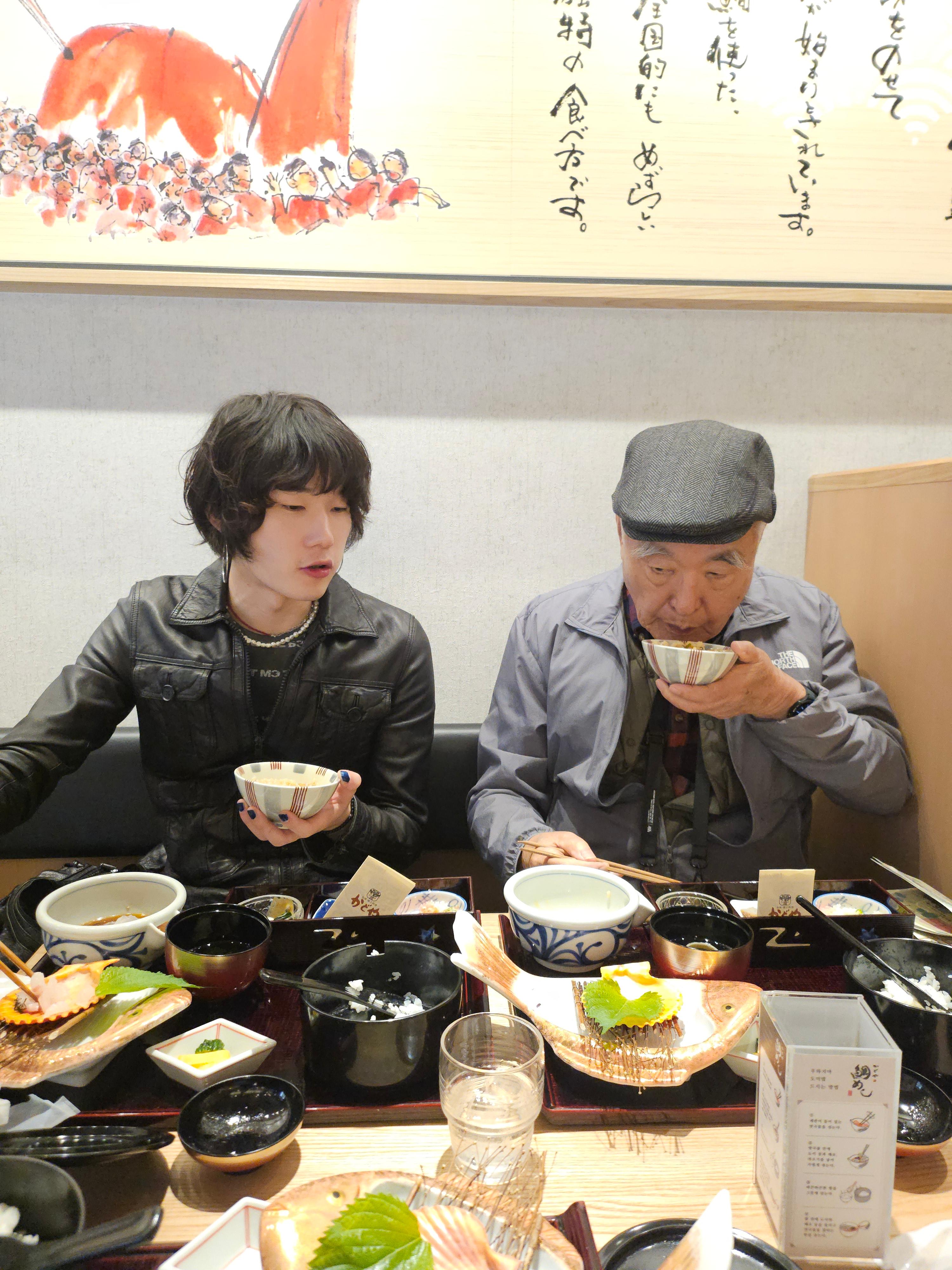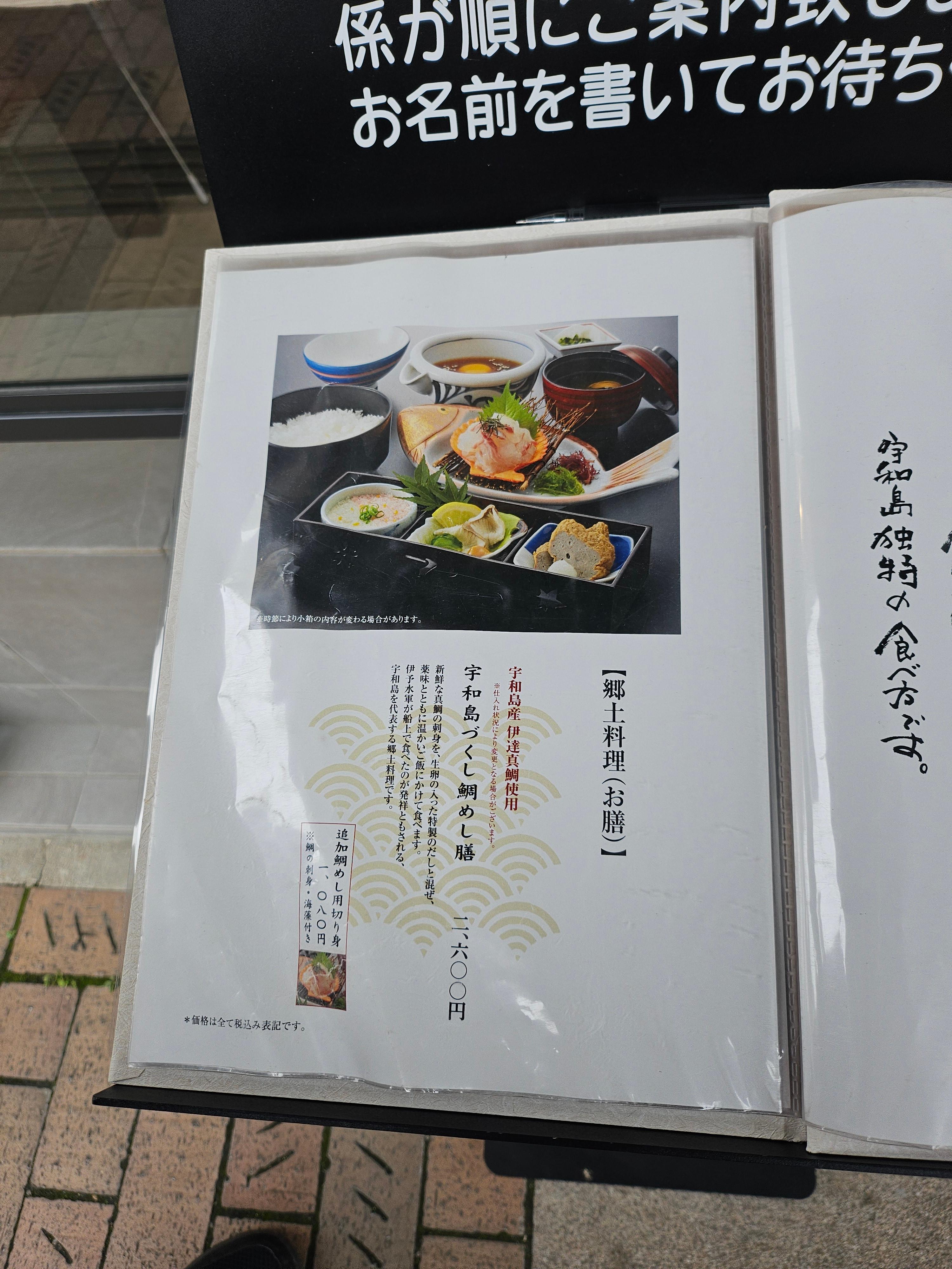 마츠야마의 유명한 음식은 도미밥이라고 하네요. 점심식사는 마츠야마성 근처에서 먹기로 하고 음식점을 찾았어요. 역시 맛집이라고 유명한 곳은 한국인 관광객들이 줄을 서서 기다리고 계시더군요. 마츠야마성과 오카이도 상가 거리가 걸어서 10분 거리에 있어서 천천히 걸으면서 깨끗한 음식점을 찾아들어갔어요. 음식모형이 음식점 앞에 잘 안내되어 있어서 그냥 들어갔는데, 알고 보니 유명한 음식점 체인이더군요. 우리돈으로 2만원이 넘는 음식값이었지만 깔끔하고 멋져서 아버지도 잘 드셨어요. "카도야 에히메 우와지마"소개합니다~ 우와지마 도미밥이 오늘의 점심메뉴입니다.