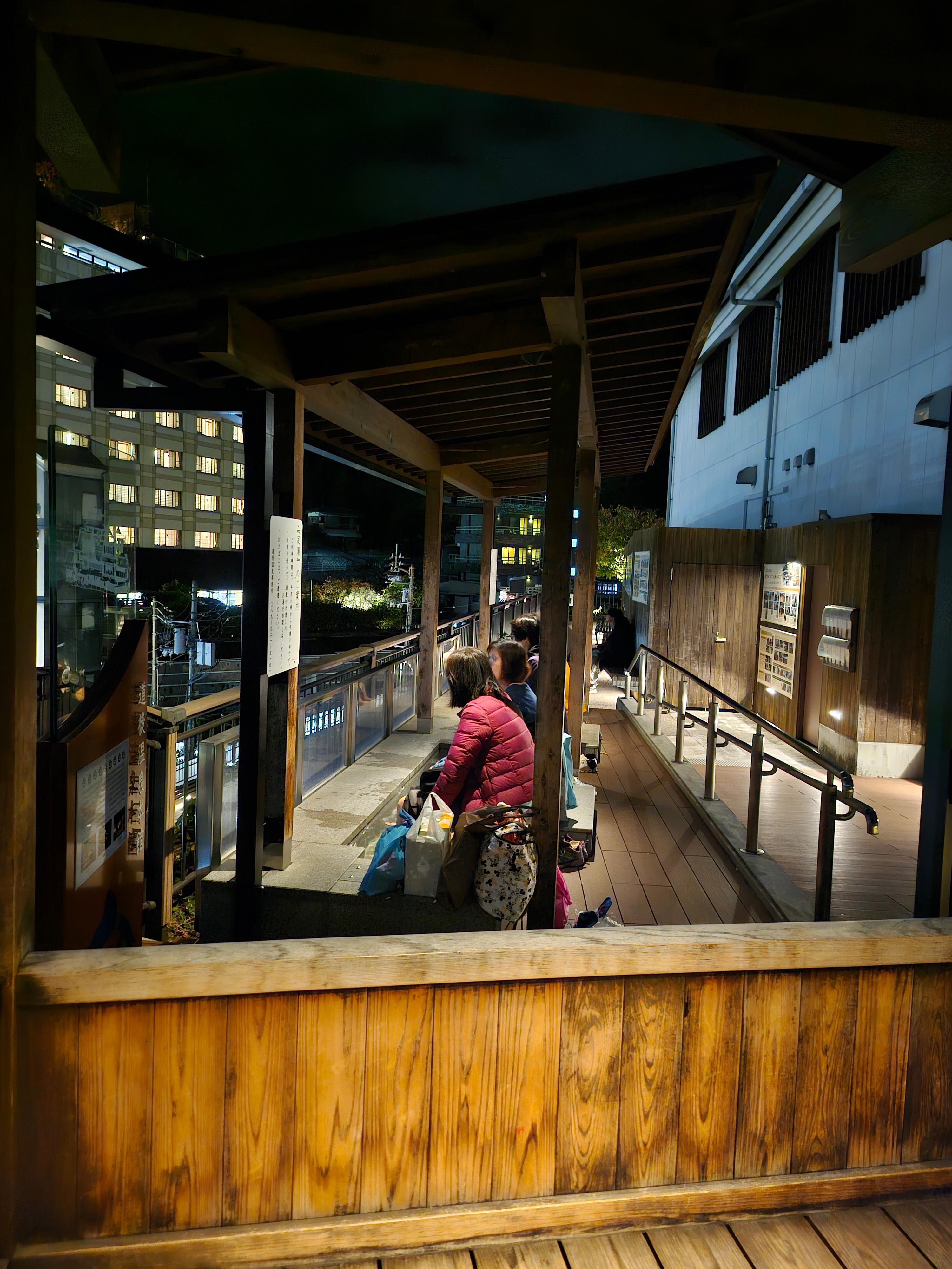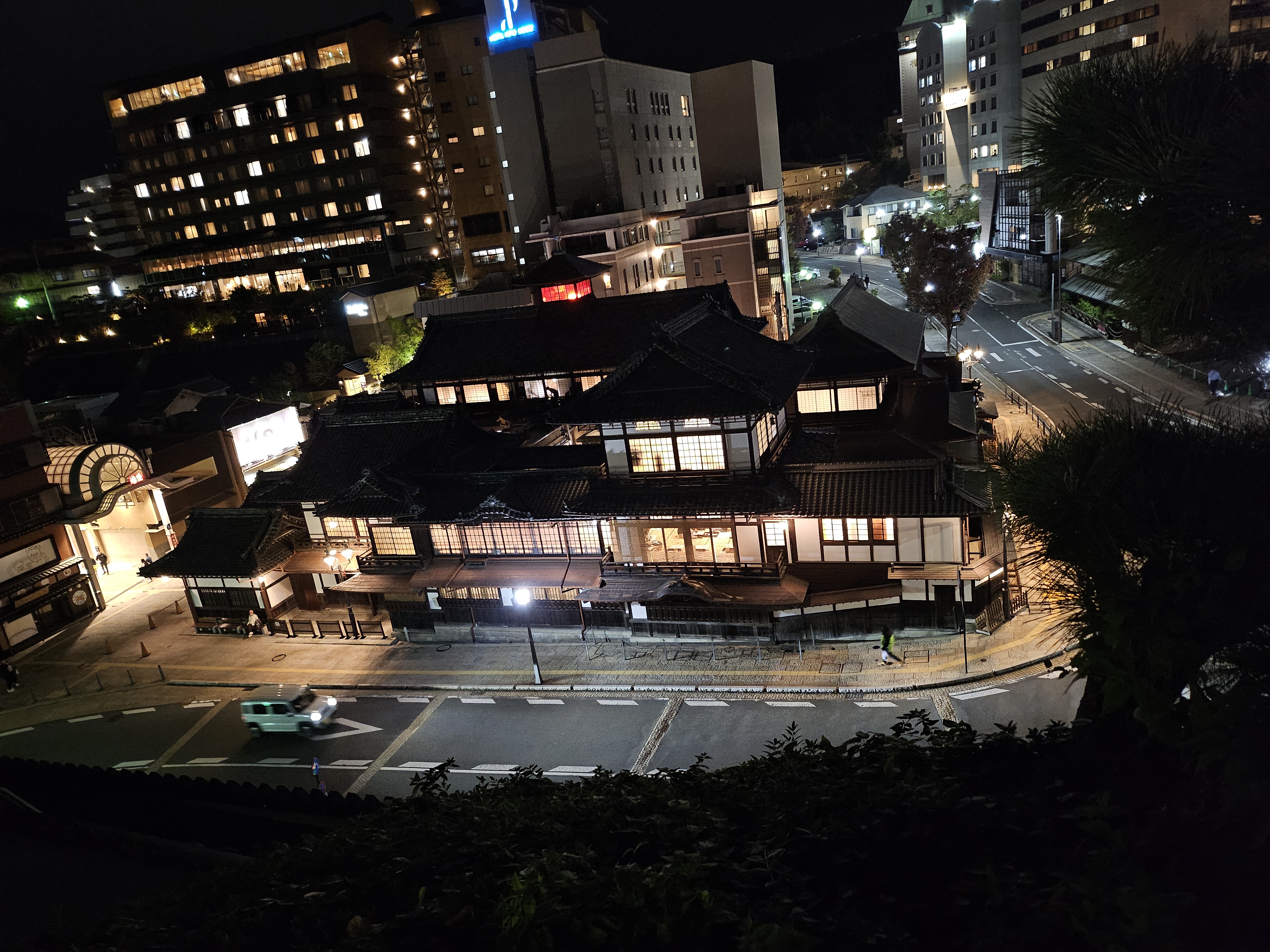 가이세키정식요리를 잘 먹고 객실로 올라왔어요. 탁자는 구석으로 잘 옮겨져 있고 요 세트 3세트가 잘 펼쳐져 있었어요. 우리나라의 우렁각시랄까? 조용히 나타나 정리해 주시는 호텔직원... 감사합니다. 아버지는 주무시고 저와 아들은 아버지의 미션을 수행하러 야행을 나왔답니다. 조용한 온천마을인 도고온천은 아름다운 야경으로 유명합니다. 도고온천의 측면에서 사진을 찍었어요. 구글지도에 도고온천산책로(족욕탕)로 검색하시면 되고요. 도고온천 본관에서 위로 올라가는 언덕이 바로 보여서 찾기에 어렵지 않아요. 저녁 8시 반인데 대부분의 가게가 닫아서 아쉬웠어요. 이자카야는 영업을 하는데, 저와 아들은 알코올 분해효소가 없는 유전인자를 지녀 아쉽게도 맥주는 마시지 못했답니다.